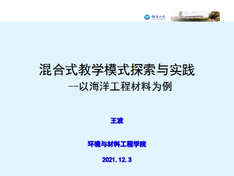 优秀课程思政示范课。王波老师以《海洋工程材料》课程建设和教学过程为例,为大家详细介绍了搭建移动式在线教学平台的思路和方法;如何将在线学习和课堂授课有机结合起来;如何采用多元化考核评价体系,诊断学生学习过程,培养学生自主学习能力;如何借助混合式教学模式为课堂注入新动力和新活力。