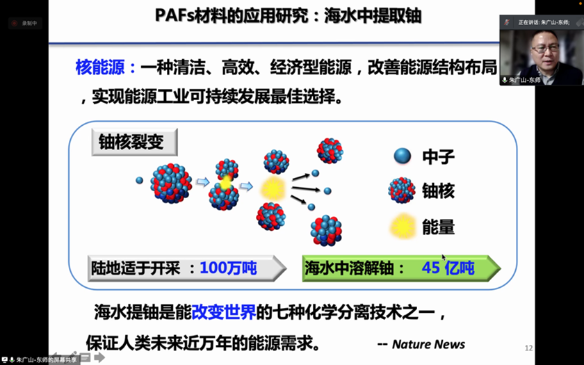 论坛第三期主题为“环境功能材料”,邀请教育部长江学者、东北师范大学化学学院院长朱广山教授和国家杰出青年科学基金获得者、吉林大学化学学院方千荣教授进行线上报告。朱教授介绍了多孔芳香骨架材料(PAFs)这种具有刚性骨架结构、开阔孔道以及超高比表面积的多孔材料,详细阐述了PAFs材料的设计、修饰及其在海水提铀、气体吸附、化学催化等方面的应用,重点讲解了环境监测及修复领域中PAFs的设计理念、合成方法及应用开发。方教授的报告以《功能导向的共价有机框架材料的定向合成》为题,介绍了一种新兴的晶态多功能材料—共价有机多孔晶体(COFs),讲解了COFs的发展历程、具体合成修饰方法和优越性能,详细介绍了该领域的最新研究进展。