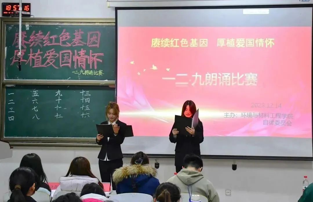 本次比赛共计16支队伍参赛,学生们精神饱满,斗志昂扬,用饱含深情与力量的声音,宣扬“一二·九”精神。一声声发人深省的话语、一句句饱满深情的颂扬,是青年的呐喊,是青春的力量,传递着对祖国的炽热情感,展现着环材学子积极向上、挺膺担当的精神风貌。