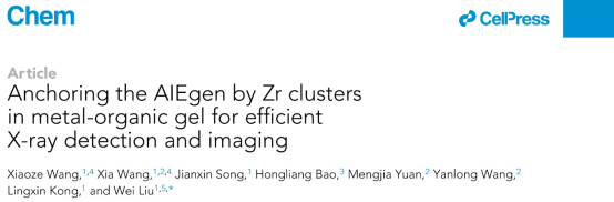 近期,Chem期刊(IF: 23.5)发表了我院刘伟教授课题组题为“Anchoring the AIEgen by Zr clusters in metal-organic gel for efficient X-ray detection and imaging”的研究论文,揭示了一例结构致密且刚性的金属-有机凝胶闪烁体的聚集诱导(AIE)辐射发光机理,展现了其用于高分辨X射线成像的巨大潜力。我院硕士研究生王小泽和教师汪遐为论文共同第一作者,学院教授刘伟为该论文的通讯作者。该研究得到了国家自然科学基金、山东省自然科学基金以及上海光源的支持。
