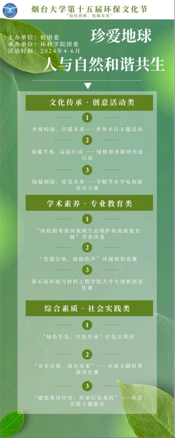 本届环保文化节以“绿色创新,低碳未来”为主题,聚焦水资源污染、垃圾分类、全球战塑、新质生产力、新污染物治理等,突出文化传承、学术创新、实践锻炼三大板块,涵盖大学生环保知识竞赛、学术沙龙、环保理念进社区等九大系列活动,倡导青年学子争做生态文明建设的倡导者和践行者。