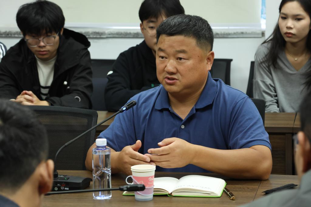 杨恩校友深情回忆了在烟大读书的四年时光,分享了工作学习心得。杨恩希望同学们珍惜大学时光,不内卷、不躺平,要真正明白自己想要什么,并为之持之以恒地奋斗。希望同学们要有国际视野,强化英语学习,既要读好书又要躬耕实践;要有创新意识,脚踏实地踏踏实做科研;要向下扎根向上生长,努力做一个追光的人。会上,教师代表就自己的科研方向与杨恩校友进行了深入交流,并在校企合作方面达成初步共识。