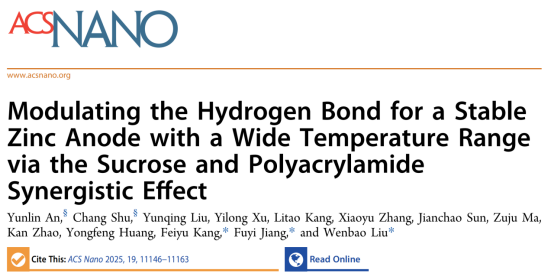 近日,我院姜付义教授团队在学术期刊ACS Nano发表了题为“Modulating Hydrogen Bond for Stable Zinc Anode with Wide Temperature Range via Sucrose and Polyacrylamide Synergistic Effect”的研究论文。本研究提出了一种协同策略,通过向聚丙烯酰胺(PAM)水凝胶电解质中添加电解质添加剂蔗糖(SUC)来提高锌负极的稳定性。制备的水凝胶电解质具有优异的稳定性和安全性,能够抑制锌负极上副反应的发生,并且实现宽温域下的优异电化学性能。这个工作为实现宽温度适应性和长循环稳定性的水系锌离子电池提供了思路。