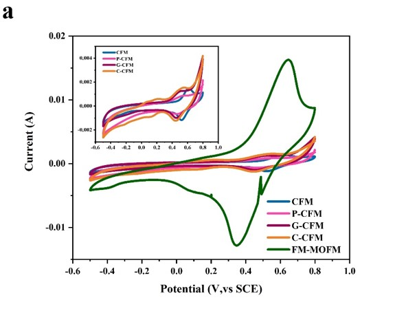如图5a所示,验证了催化剂对膜电极的电化学催化作用。P-CFM的氧化还原峰明显低于碳纤维布。添加GO后氧化还原峰显着增加,说明GO对膜电极的电催化性能有部分影响,这与我们团队前期的研究结果一致。从C-CFM 和G-CFM的CV曲线可以看出,膜的还原峰位置几乎相同,这对电极的电容性能产生了积极的影响,因为电极的电导率增加。支持的催化组分。对于FM-MOFM,峰值电流急剧增加,图5a中出现了两个明显的氧化还原峰。结果表明,含Fe-Mn催化剂的 FM-MOFM 表面的质子比对照膜电极上的质子更容易被还原。在 FM-MOFM表面观察到对 ORR 的更高催化活性。更好的氧化还原性能可能是由于活性锰离子将Fe(Ⅲ)还原为Fe(Ⅱ),该反应在热力学上是可行的。Fe3+ /Fe2+和Mn4+/Mn3+的还原电位可以通过以下反应机理有效地说明。因此,Fe-Mn双金属混合价态的存在触发了膜电极具有更有效的氧化还原特性。