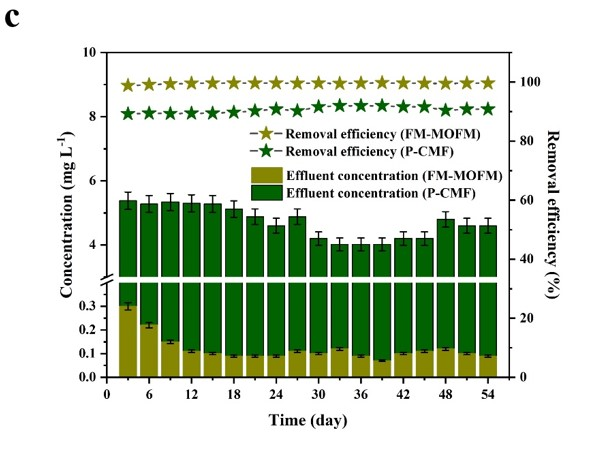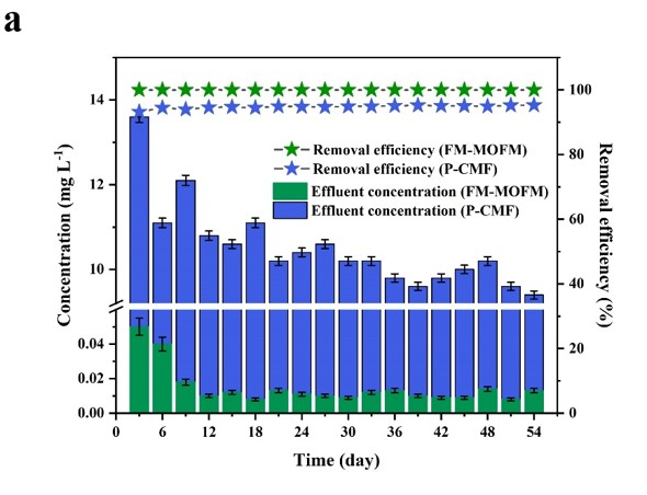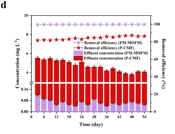 FM-MOFM和P-CFM作为对照组的金属还原去除性能是用Cu2+、Zn2+、Cr2O72-和Ni2+混合溶液进行的,结果如图7所示。对模拟电镀废水(Cu2+, 200 mg L-1; Zn2+, 200 mg L-1; Cr2O72-, 50 mg L-1; Ni2+, 30 mg L-1)。为了提高实际电镀废水的抗冲击性,将Cu2+和Zn2+的浓度提高到200 mg L-1。在如此高的负载下,当FM-MOFM作为阴极电极时,Cu2+(图7a)和Zn2+(图7b)的去除效率仍然接近100%(接近94%)P-CFM作为对照组)。Cr2+(图7c)和Ni2+(图7d)在输出水中的浓度在0.008-0.050 mg L-1和0.007-0.055 mg L-1之间,(4.020-5.380 mg L-1和 3.820–5.500 mg L-1(以P-CFM为对照组),完全满足项目排放标准。模拟电镀废水中Cr2O72-和Ni2+的浓度分别为50 mg L-1和30 mg L-1,原水重金属负荷高于实际电镀废水(Cr:6.15 mg L-1,Ni:7.82–9.80 mg L-1)。然而,该SBRS的金属去除效率基本接近100%(当P-CFM作为对照组时为86%–95%)。与同类研究比较,新系统辅助FM-MOFM出水水质优于或接近对比系统。测试结果表明,四种金属元素的排放浓度相对稳定,直接或间接达到排放标准。更好的性能证明FM-MOFM作为阴极电极可以明显提高SBRS在废水处理中的性能。在实际测试中,明显观察到阴极室底部和FM-MOFM表面有沉淀。金属离子去除效率如此之高的原因可能得益于各种机制的结合。除了生物电还原机制的主导作用外,电凝和生物降解等辅助机制需要后期验证。