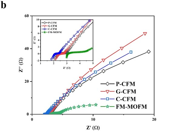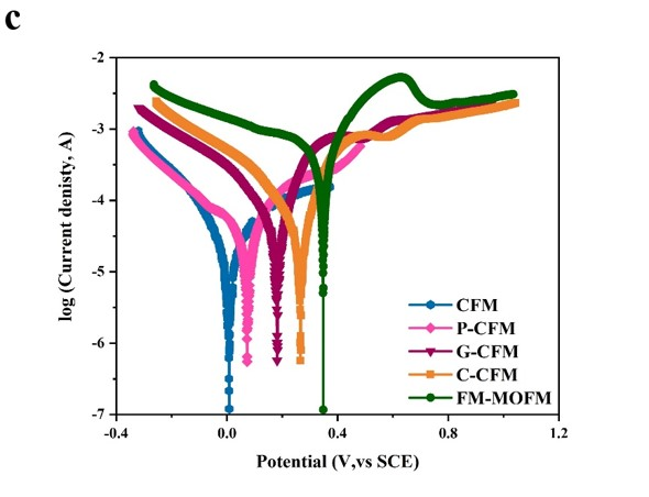 EIS提供了电活性材料和CFM电极之间的界面特性和电子转移动力学信息。与原始CFM相比,所有膜电极都显示出完全不同的Nyquist图,所有膜电极的溶液电阻在1.5-3.0 Ω之间。由半圆直径表示的电荷转移电阻随着催化剂(P-CFM 1.98 Ω、G-CFM 1.81 Ω、C-CFM 1.71 Ω 和 FM-MOFM 1.39 Ω)的加入而减小,表明加入催化剂明显导致电荷转移电阻降低。特别是加入纳米Fe-Mn催化剂后,电荷转移阻力显着降低,证明Fe-Mn催化剂有效降低了向电极和远离电极的传质过程中的扩散阻力。SBRS中的低极化电阻直接导致较小的活化损失、浓度损失和更高的交换电流密度。交换电流密度(i0)是通过外推塔菲尔斜率的线性区域获得的(图5c)。较高的交换电流密度对应于较低的极化电阻,并且还表现出较高的电荷转移率。