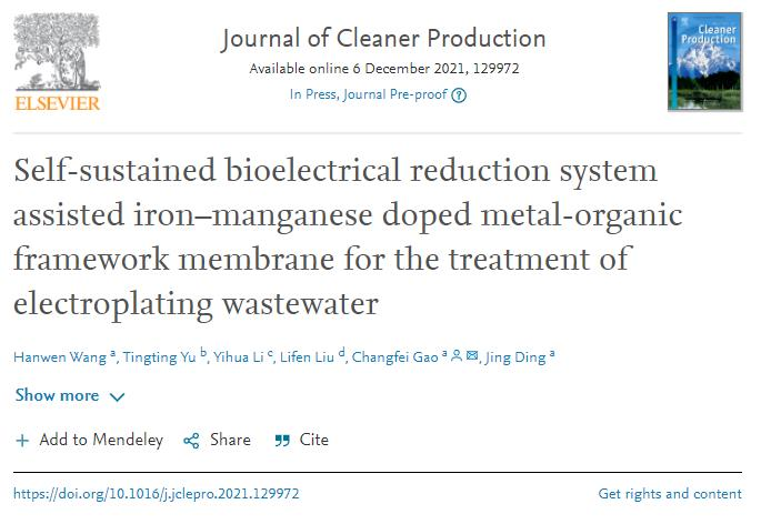 近日,我院高常飞副教授课题组在Journal of Cleaner Production上发表了题为“Self-sustained bioelectrical reduction system assisted iron–manganese doped metal-organic framework membrane for the treatment of electroplating wastewater”的研究论文。(第一作者:王涵文,通讯作者:高常飞副教授(四虎影院