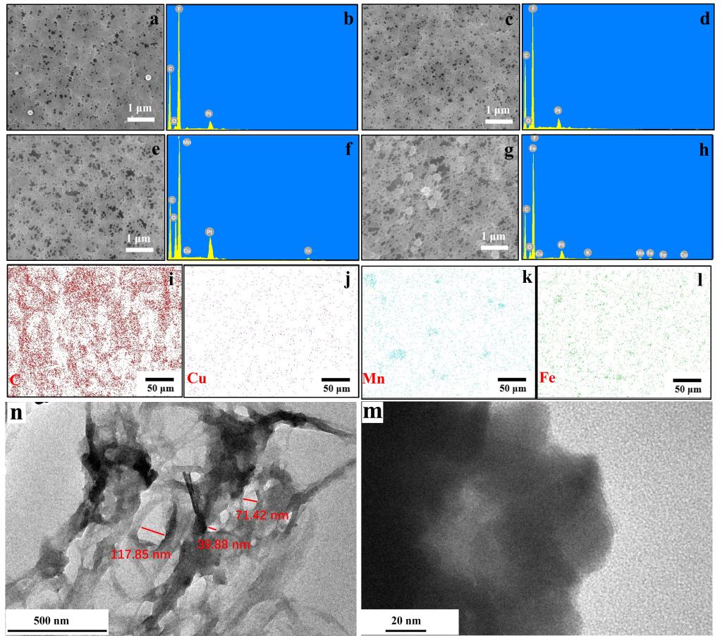 通过EDX分析证实了FM-MOFM中的催化剂组分(图2h)。没有催化剂的膜电极表面(图2b)和添加 GO 的膜电极(图2d)仅显示氟(F)以及碳(C)和氧(O)的存在,这是归因于PVDF元素的贡献。当加入我们实验室制备的MOF时,C-CFM表面出现了新元素铜(Cu)(图2F)。分析结果表明,MOF在C-CFM的膜表面具有良好的分散性,促进了膜电极孔结构的改善和导电性。由于添加了磁性Fe-Mn NP,在 FM-MOFM 表面检测到铁(Fe)和锰(Mn)(图2h)。元素分析谱结果表明,FM-MOFM中的催化剂在膜电极制备过程中被磁极拉动,有效地促进了金属催化组分向膜电极表面迁移,提高了催化剂的分散率。膜电极表面的成分。纳米催化剂均匀分散在膜电极表面(图2i-l)并且纳米粒子在膜中的均匀分散有利于微孔的形成。从图2n-m可以看出在 FM-MOFM中没有大颗粒团聚,催化剂均匀分散在电极膜内。电极膜表面的孔径大多在100 nm以下。这些微小的孔隙为膜电极提供了更大的比表面积,从而增加了溶液与电极膜之间的接触面积。溶液中的离子与电极膜接触的可能性增加。催化剂的均匀分散可以使电极膜表面更有效。