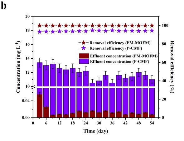 环境污染一直是人类关注的重大问题,与人类健康密切相关,尤其是重金属污染。水生生态系统中的重金属污染非常普遍。进入人体的金属离子会严重损害器官和身体机能。因此,从这些系统中去除金属离子是绝对必要的。目前去除废水中重金属的方法主要有化学沉淀法、反渗透(RO)膜分离法、离子交换树脂吸附、微生物或材料吸附和溶剂萃取。所有这些方法不仅高,而且消耗大量能源,产生二次有害产物。因此,需要一种新的低能耗方法来处理污水处理厂的重金属。作为一种利用微生物代谢处理重金属废水的绿色技术,微生物燃料电池(MFC)已成为最有前景的废水处理方法。然而,由于存在结构因素(包括间隔物的选择、电极间距和电极面积等)的限制,MFC的高内阻、低功率的缺点仍然需要解决。MFC阴极电活性催化剂的催化效率会影响末端电子受体与电子的结合率,这严重限制了MFC的整体性能。尽管许多学者对MFC的性能和结构进行了优化,但这些问题仍然严重限制了系统的应用。为了提高阴极效率,掺杂不同的金属催化剂已成为最佳方法。在这项研究中,建立了结合MFC和MBR的自持生物电还原系统(SBRS)。铝阳极(铝片)和石墨/活性炭颗粒生物阳极一起使用。同时,一种新型低成本开发的铁锰掺杂金属有机骨架膜(FM-MOFM、GO/HKUST-1/Fe-Mn/聚偏二氟乙烯(PVDF))作为阴极和过滤介质,可有效去除重金属金属。系统研究了膜电极的电化学特性及其对电镀废水中重金属的电化学还原性能。本实验的研究目标是:(i)以GO、Mn和Fe为催化剂,制备高效廉价的掺杂HKUST-1的复合膜电极,以提高重金属去除效率和发电;(ii) 使用各种表征技术来确定复合膜电极的特性;(iii) 分析 SBRS 对各种重金属离子的能效;(iv) 研究开发的膜电极与重金属之间的相互作用,以确定生物电还原机制。