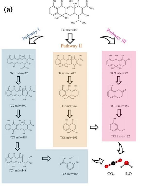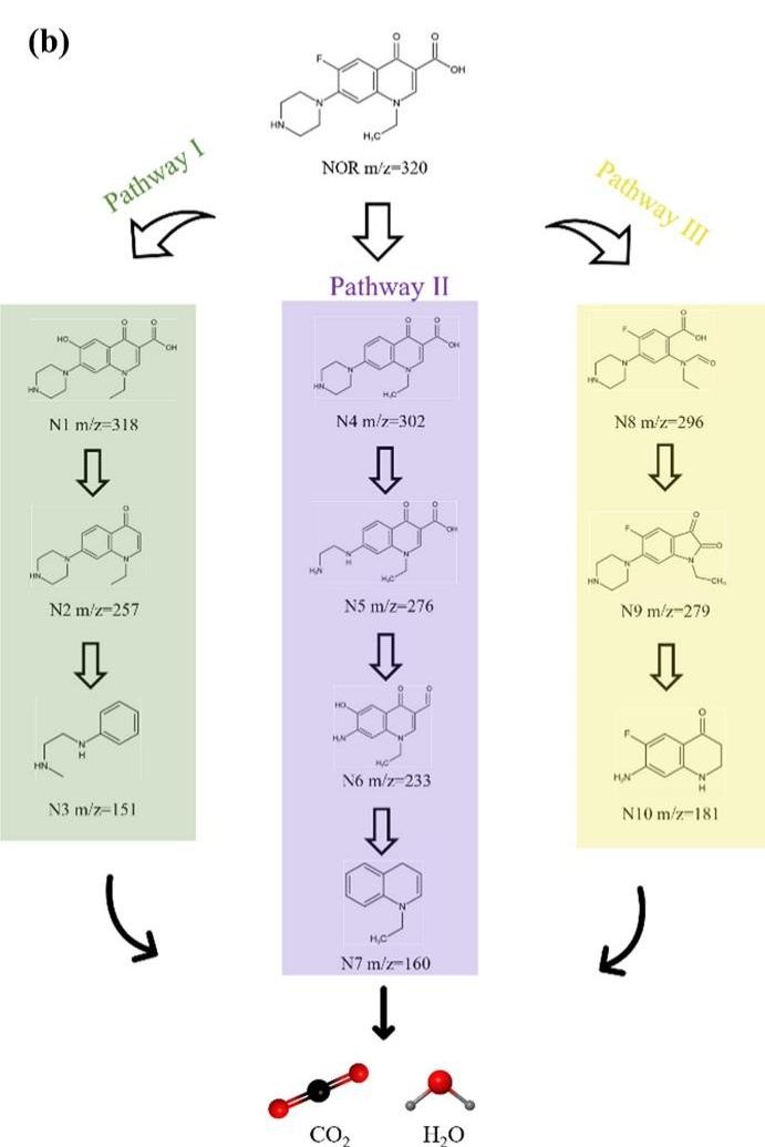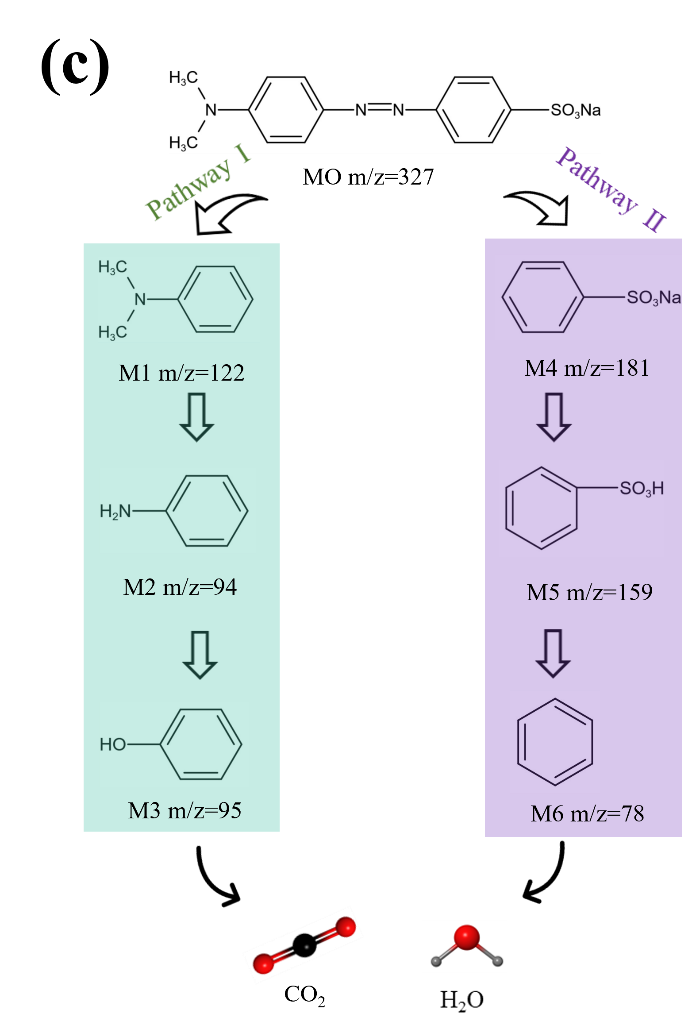 通过LC-MS检测四环素,诺氟沙星和甲基橙污染废水降解过程中产生的中间体。最终都形成最终产物二氧化碳和水。