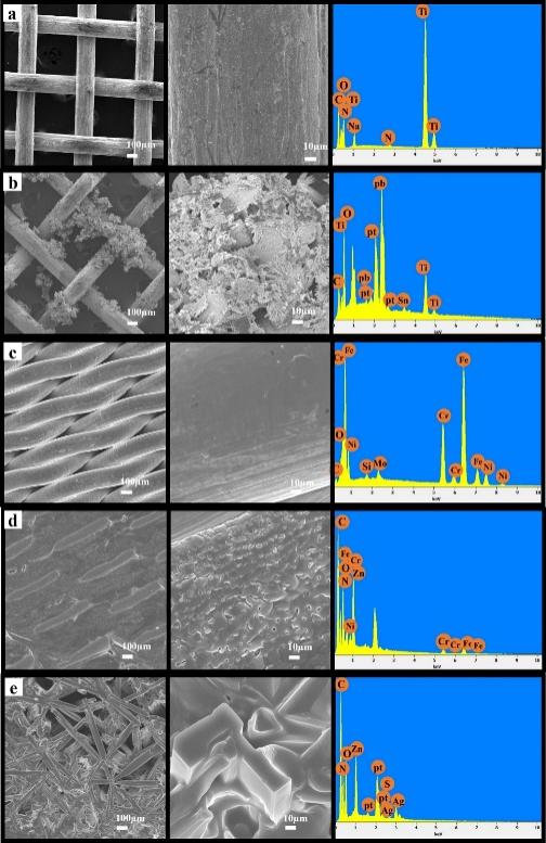 通过SEM检测催化电极的表面形貌。处理后的钛网表面光滑。根据EDS分析,钛网的主要元素为Ti,未附着其他杂质。电沉积30分钟后,SnO2-PbO2颗粒已经附着在钛网表面,分布比较均匀。SnO2-PbO2阳极表面粗糙度增加,比表面积增加。经酸洗碱洗后的不锈钢网表面光滑,易于电沉积。EDS分析表明,Fe、Cr、Ni、Mo、C等元素均为不锈钢基体所含元素,无其他杂质。在ZOF-SS表面形成致密的电沉积层,旁边形成的ZOF颗粒具有清晰的晶体结构并且排列紧密。通过EDS分析,Zn和N元素被添加到电极表面。表明在电极表面成功合成了ZOF。Ag@ZOF与SS紧密贴合,SS被完全覆盖。表面形成许多针状结构,中间掺杂ZOF晶体。从EDS还可以看出,大量的银和硫元素聚集在电极表面。结果表明,Ag@ZOF催化剂完全附着在SS上,Ag@ZOF-SS电极具有优异的催化性能。