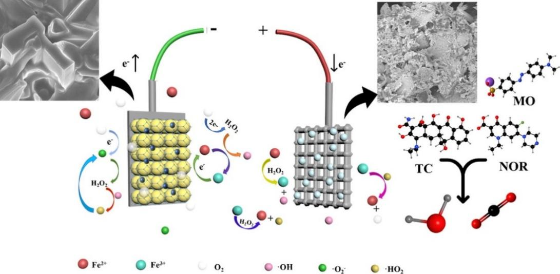 高级氧化工艺(AOPs)是一种快速有效的去除有机物的技术。在本实验中,牺牲铁棒阳极被引入到酸性溶液中的反应器中,牺牲阳极不接电源,但能溶解适量的Fe2+参与芬顿反应。阴极和阳极由直流供电。阴极表面的氧分子通过双电子还原反应生成H2O2。生成的H2O2与溶液中的Fe2+迅速反应生成·OH和Fe3+。·OH可以非选择性地氧化有机物并使其降解。这是一种新的Fenton装置,可以同时在线生成 Fenton 反应所需的两种试剂(H2O2/Fe2+)。