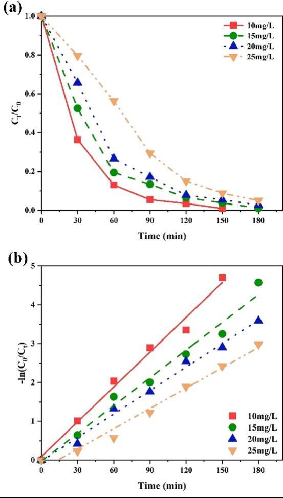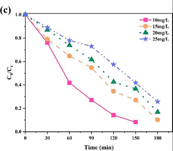 本实验研究了四环素,诺氟沙星和甲基橙初始浓度对污染物降解效率的影响。实验以Ag@ZOF-SS电极为阴极,PbO2/SnO2电极为阳极,调节pH为3,铁面积为10 cm2,施加电流强度为9 mA,设置初始浓度为 10 mg/L、15 mg/L、20 mg/L 和 25 mg/L的污染物溶液,对污染物进行降解。实验表明,随着TC浓度的增加,降解所需的时间增加。当污染物浓度为10mg/L时,经过150分钟的降解,TC的降解率达到99.1%。当浓度增加到15mg/L、20mg/L和25mg/L时,150分钟后降解效率分别达到99%、97.8%和95%。
