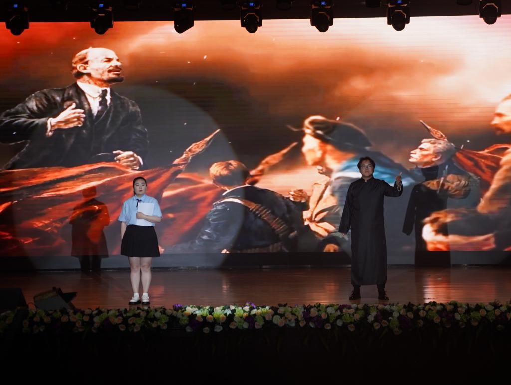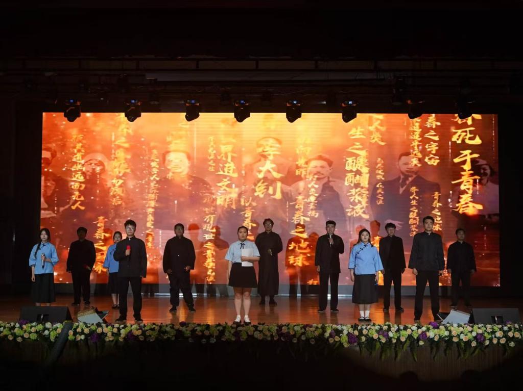 由我院研究生张俊龙和本科生杨浩然同学领衔主演的红色舞台剧《信仰的力量》,通过扮演女大学生和青年革命家瞿秋白,以舞台剧形式,再现了早期中国共产党人在至暗时刻的精神高度和革命觉悟。剧情以瞿秋白翻译的《国际歌》为线索,通过两幕场景体现瞿秋白先生的“呐喊、奋斗、献身、传承”的革命经历。剧中当瞿秋白高歌赴刑的历史场景重现时,宣讲团同学们上台高唱国际歌,完成了一场跨越时空的对话。
