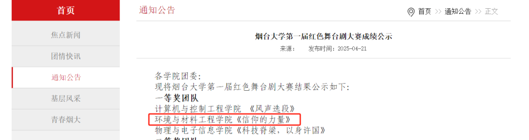 深入学习贯彻习近平文化思想,扎实推进新时代爱国主义教育走深走实,传承红色基因、赓续红色血脉,此次获奖不仅展现了环材学子坚定理想信念、团结协作的精神风貌,更彰显了我院“三全育人”教育取得了丰硕的成果。接下来,学院将充分发挥“红色薪火”大学生宣讲团的作用,致力于思政教育与实践育人的深度融合,构建“理论+文艺+实践”的立体化传承体系,让革命精神在青年学子心中生根发芽,实现“大思政课”的铸魂育人价值。
