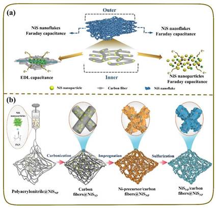 2 NiSNF/CF@NiSNP复合材料的(a)结构设计理念和(b)制备流程示意图